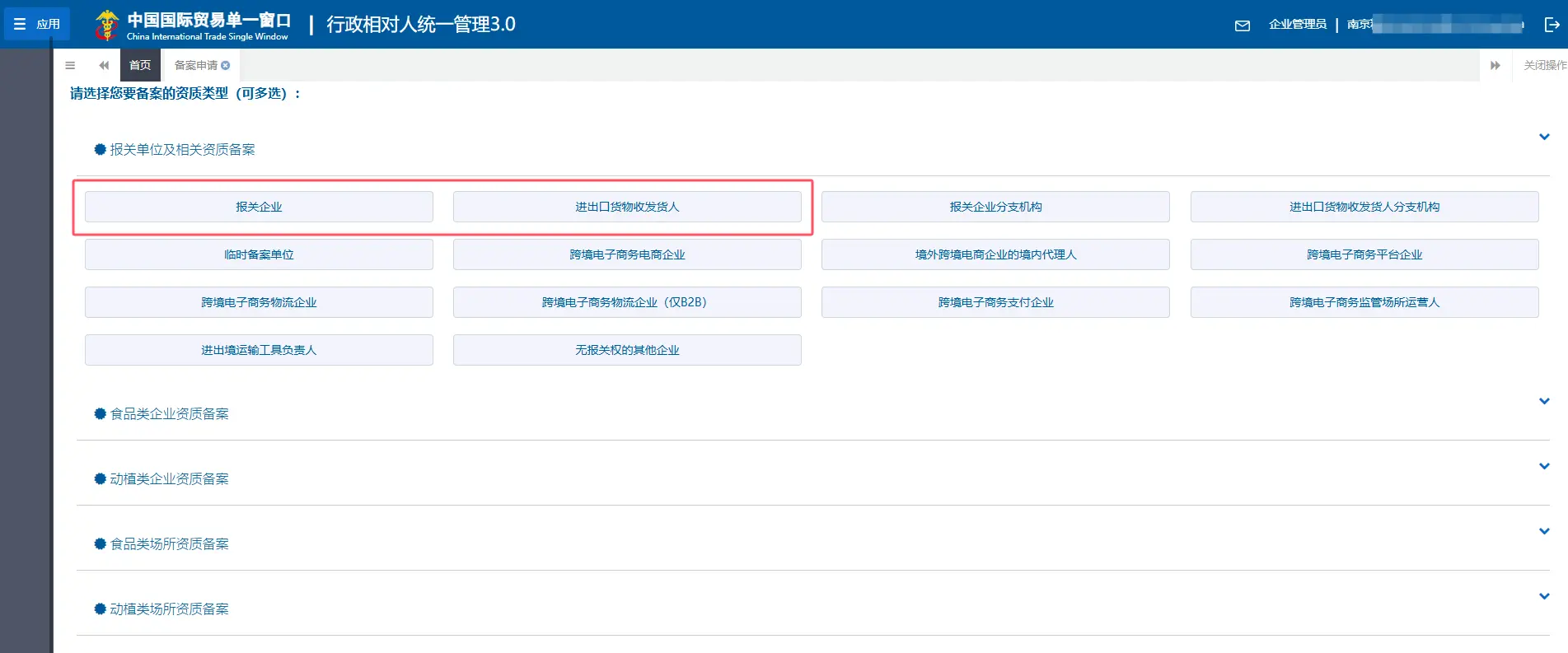 10、选择报关单位及相关资质备案,如果以后要自己报关的,可同时选择两个; 如果以后走物流公司或者报关行报关的,只选进出口货物收发货人即可。