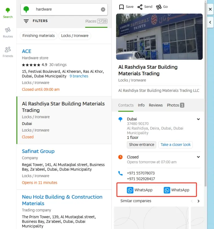 协守外贸说明:2GIS.ae比较好的地方是他有WhatsApp的字段,但不知道是被骚扰过多,还是其它原因,2GIS.ae已关闭了筛选条件里的【筛选有WhatsApp】企业的这一项,而且Queenie在查看某些行业的时候,有WhatsApp的企业较少;