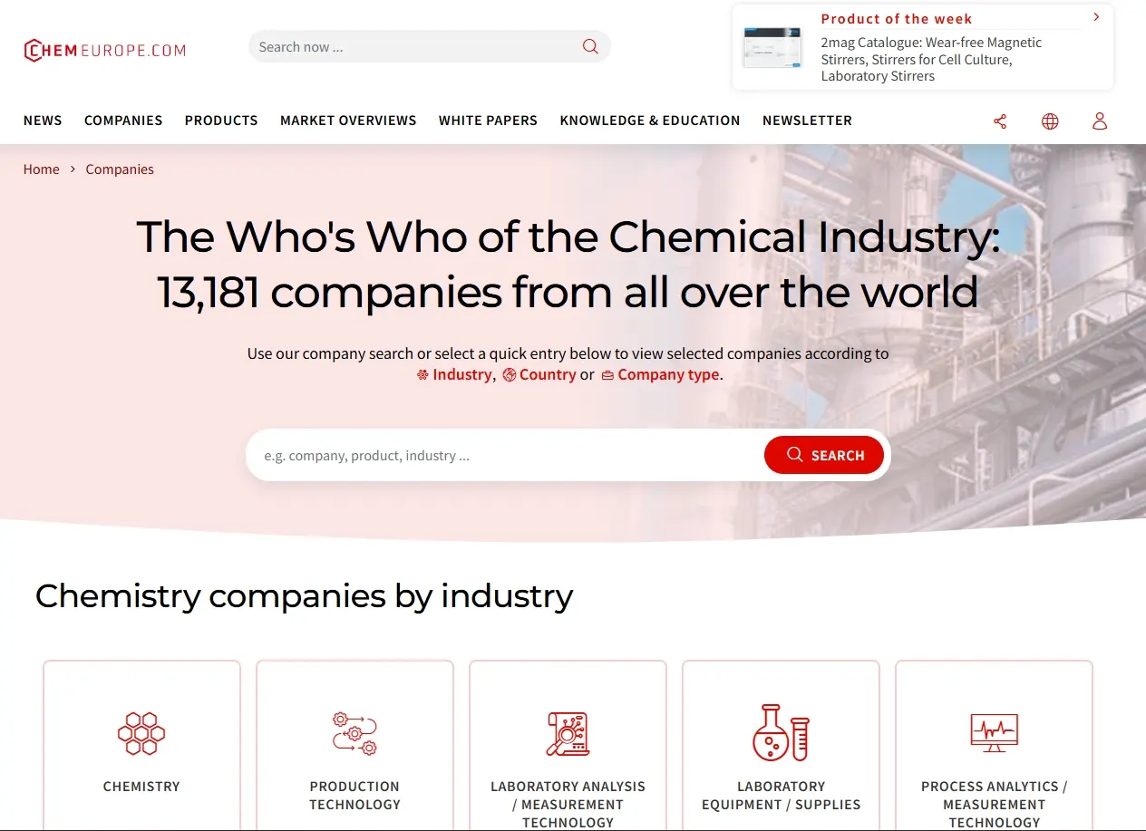 Chemeurope(https://www.chemeurope.com/en/companies/): Chemeurope 提供了一个全球化 工企业的超级数据库。你可以针对地区或领域进行搜索 ,轻松找到潜在客户。