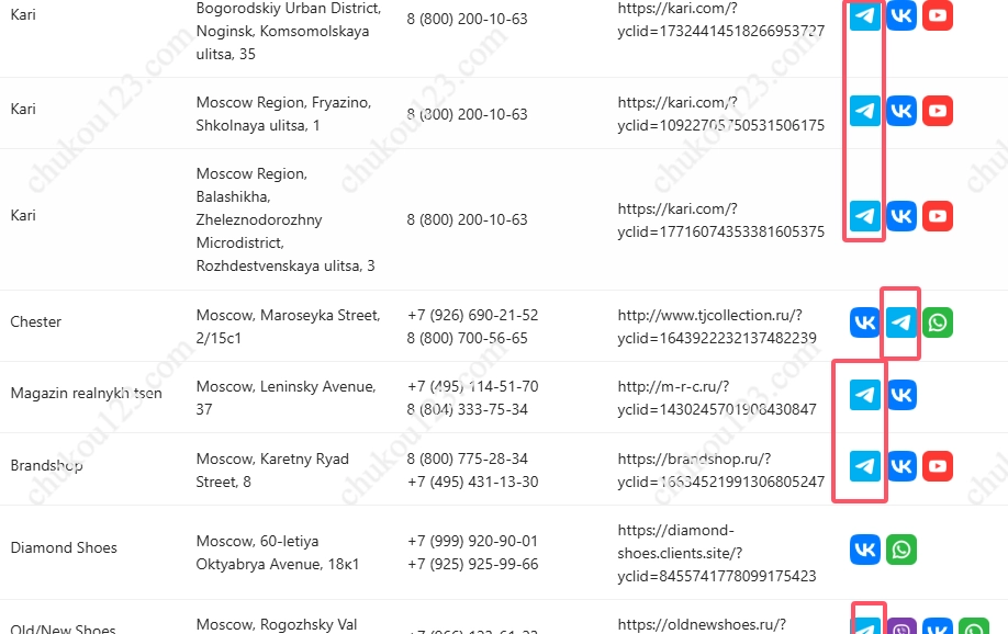 Yandex地图主要针对俄罗斯及周边区域。类似国内百度地区,属于俄罗斯本土地图。用于开发俄罗斯有实体经营地址的企业非常不错,信息里包括:公司名、地址、电话、网址、WhatsApp、telegram、vk等链接,摘取麻烦。