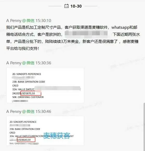 2、2025年1月13日, 厦门做吊牌的用户反馈通过麦穗循环SOP功能开发出来的客户到款3000美金,还接了海外客户在中国制衣厂的订单。