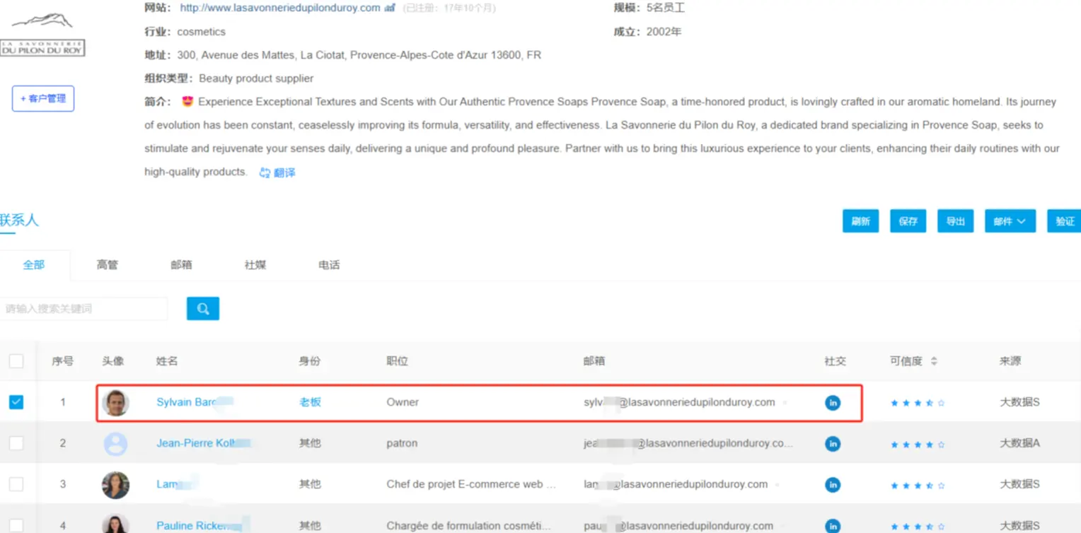 Queenie家海外获客工具分分钟搞定,La Savonnerie du Pilon du Roy 2002年成立,网站运营17年10个月;老板叫Sylvain Bargues,2009年加入领英,领英有1年多没上了,链接是:https://www.linkedin.com/in/sylvain-bargues-84414b17/ ,老板号码是:+791610532** 。
