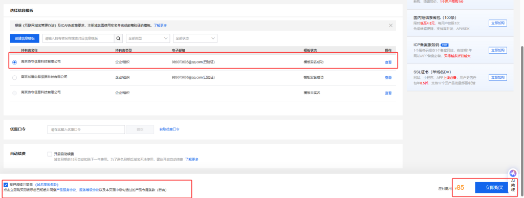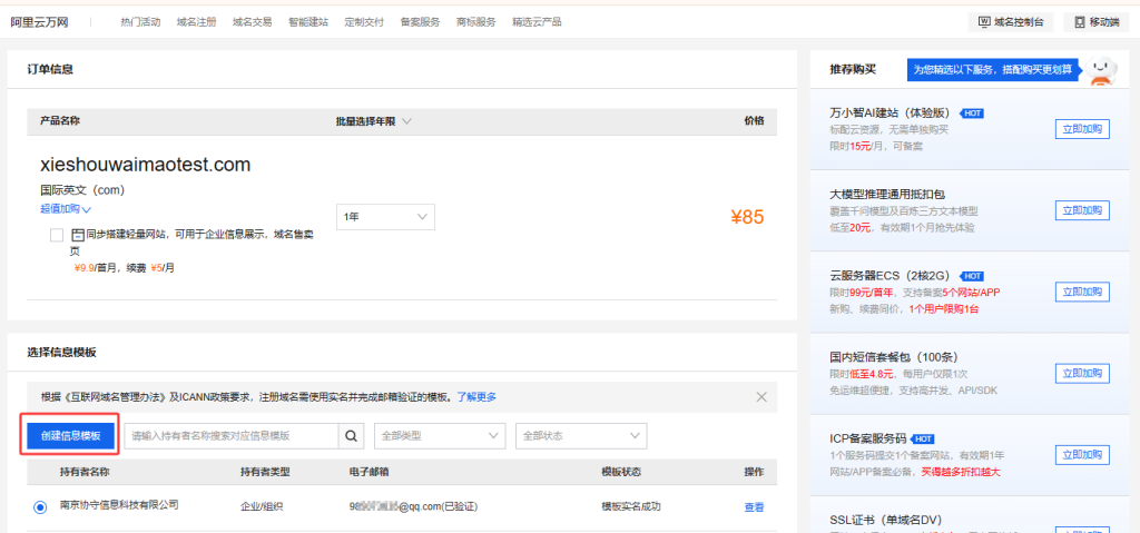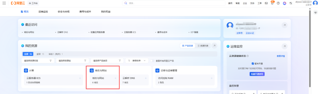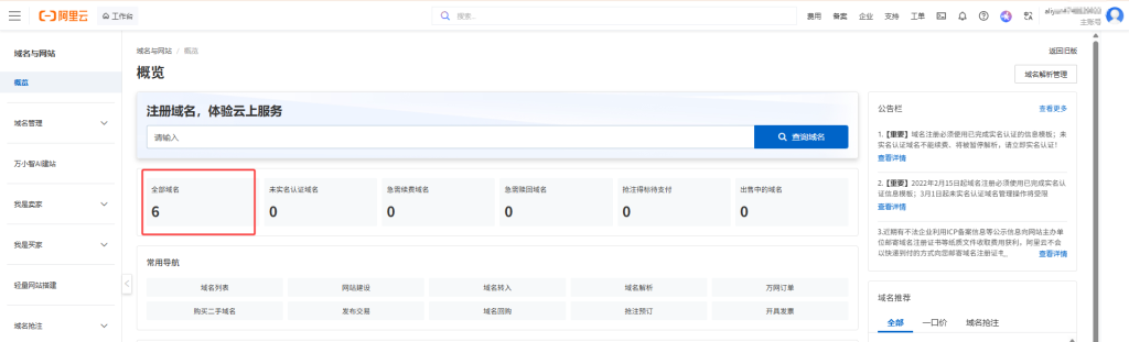 如果后期要查看自己的域名,以及进行企业邮箱注册、网站解析等,继续按这个操作即可(推荐跟着操作下,后期需要时会更熟悉)