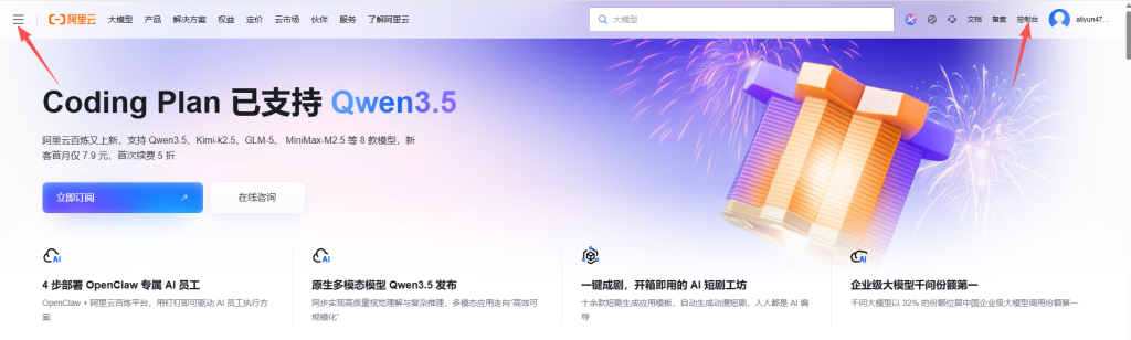 第十步:回到阿里云首页,任意点击图示中任意位置,进入到控制台;