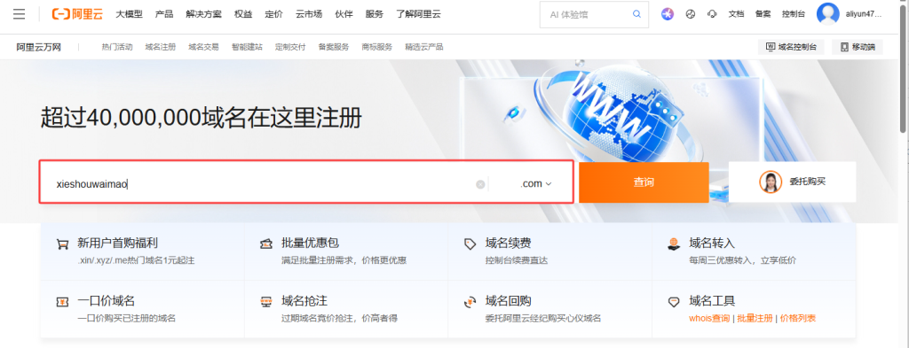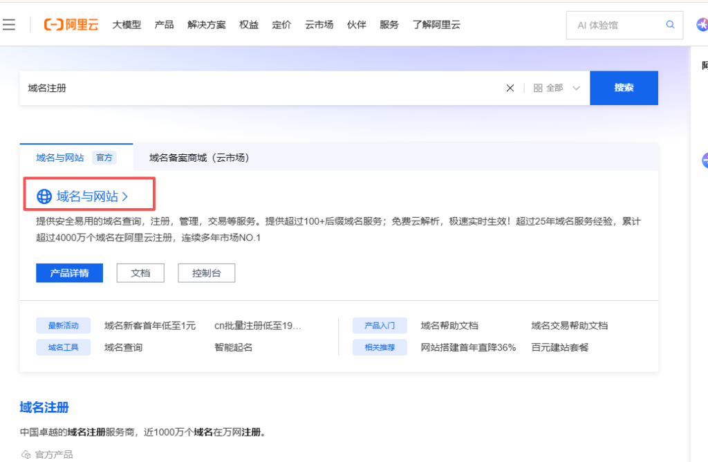 第二步: 由于阿里云服务太多,域名注册页面不好找;直接搜索框搜索“域名注册”