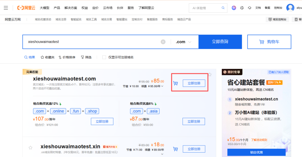第六步:找到未被注册的想要的域名后,选择立即注册。如需要注册多个域名,可先入购物车后,后面一次性付款。