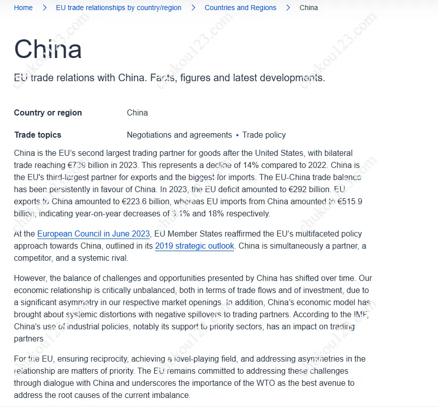 https://policy.trade.ec.europa.eu/eu-trade-relationships-country-and-region/countries-and-regions/china_en 欧盟贸易政策门户,其中的中国页面绍了欧盟与中国的贸易关系,包括双边贸易数据、投资、政策框架、关税、市场准入等信息,是了解中欧经贸合作的重要官方资源。