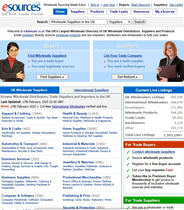 11、https://www.esources.co.uk/ 英国的B2B平台,专注于批发商、制造商和供应商。