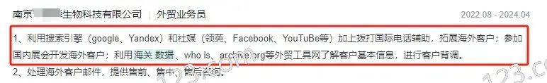 - 南京某生物科技有限公司,通过Google、Yandex、Facebook、海关数据等开发客户,利用海关数据、whois、archive.org 分析客户