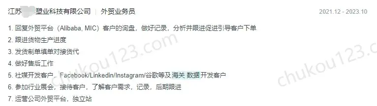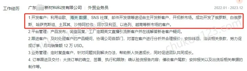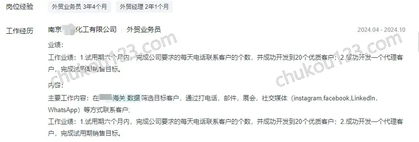 - 南京某化工公司,通过海关数据筛选目标客户,通过电话、邮件、展会、社媒等方式联系客户,公司要求每天电话数量。