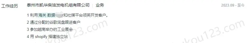 - 泰州市某发电机组公司,通过海关数据、领英等开发国外客户,并进行独立站营销