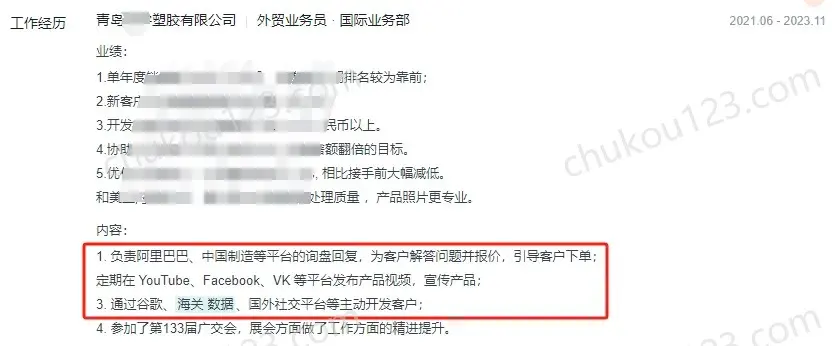 - 青岛某塑胶公司,通过2大B2B平台接询盘,并通过Google、海关数据、国外社交平台等主动开发客户,还会定期在YouTube、Facebook、vk等发布产品视频,进行品牌宣传。