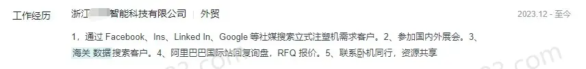 - 浙江某注塑机公司,通过Facebook、ins、领英、Google等搜索目标客户,参加展会,B2B平台回复询盘,以及海关数据开发客户;