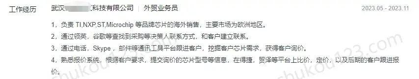 - 武汉某芯片公司,通过领英、Google等开发欧洲客户,找到采购决策人联系方式后,通过电话、Skype、邮件等开发客户;