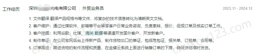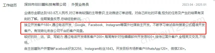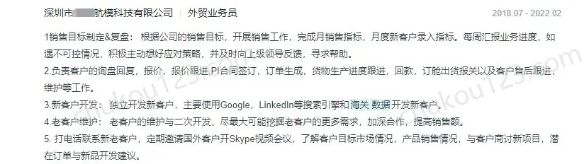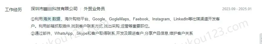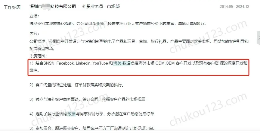 - 深圳某科技公司,通过海关数据、海外电商平台、Google、Googlemaps、facebook、ins、linkedin等开发国外客户,通过工具获取采购负责人等联系方式,通过邮件、WhatsApp、Skype等联系客户;