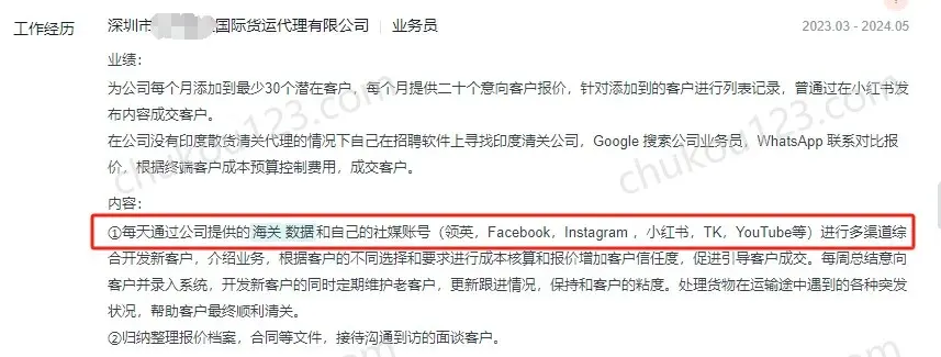 - 深圳某国际货运代理公司,通过海关数据、facebook、领英、Instagram等渠道开发新客户,每个月最少30个潜在客户。