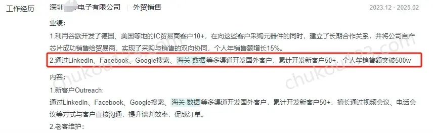 - 深圳某电子元器件公司,通过linkedin、facebook、Google搜索、海关数据等多渠道开发国外客户,累计开发新客户50+,成交500W;