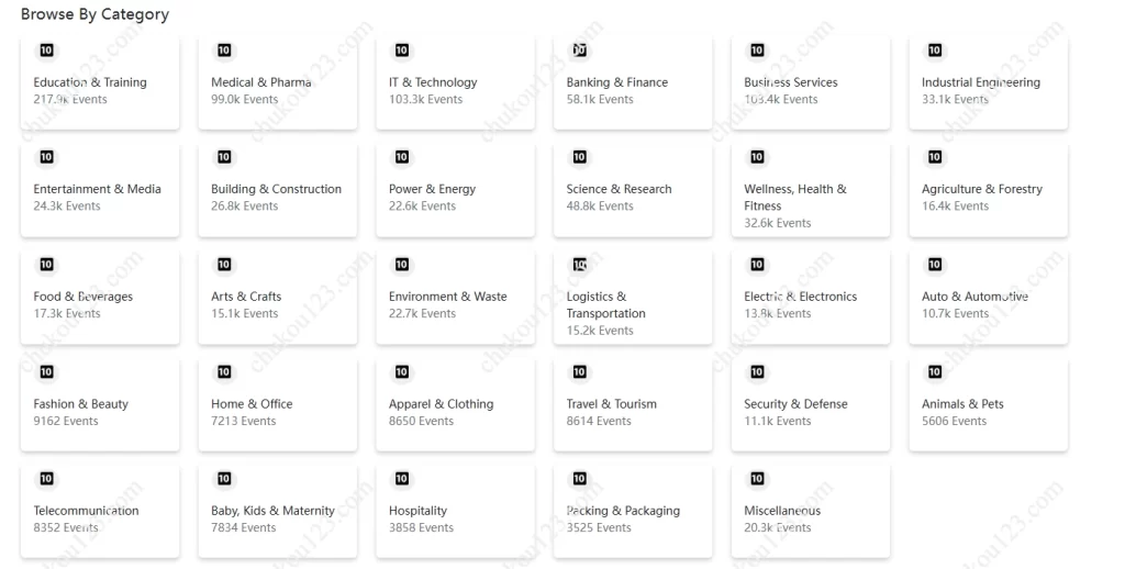 参展很多客户会想说:我们想参加展会,你知道有什么我们能参加的展会吗?你可以通过这样的网站直接去找,他其实做了非常明显的分类,比如说在汽配等。