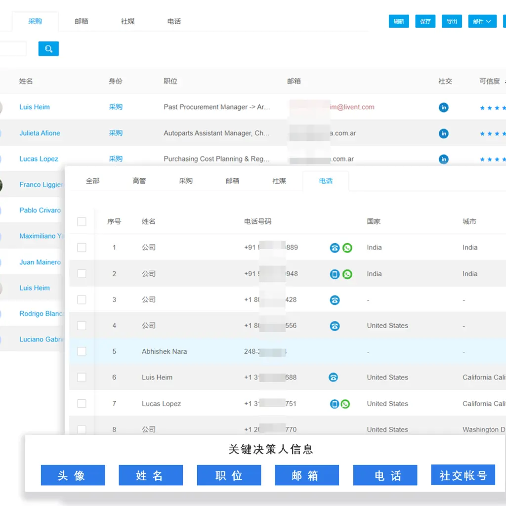 ✅ 一键触达买手负责人—— 通过协守海关数据系统,一键挖掘买手决策人联系方式;包含:姓名、身份、职位、邮箱、社媒、电话等;同步企业背调,省时、省心、更高效