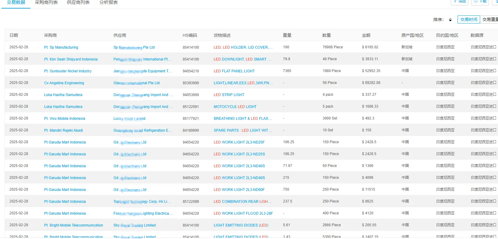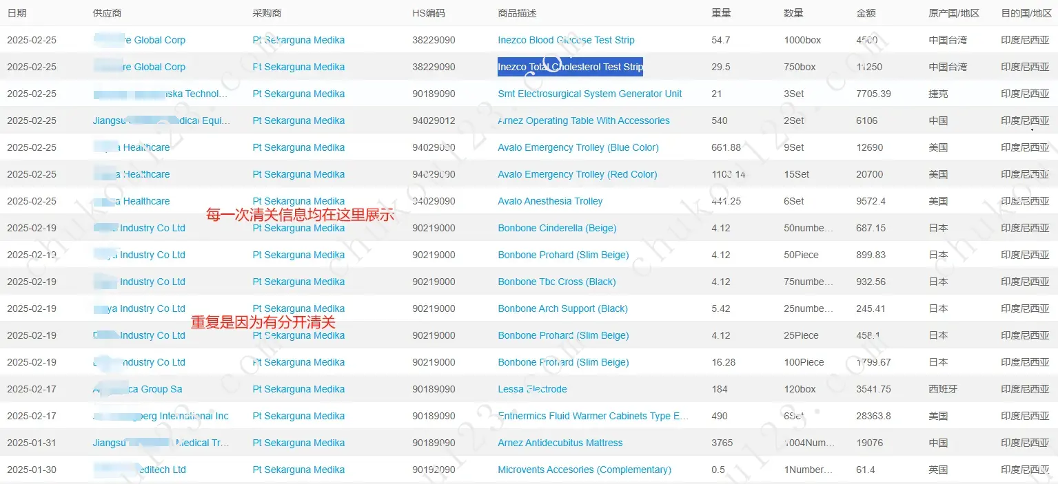 可以看到客户每一次的采购明细,时间、重量、数量、金额、原产国等等; PS:若印尼海关处没有记录到指定企业的信息,则查不到具体的采购明细;