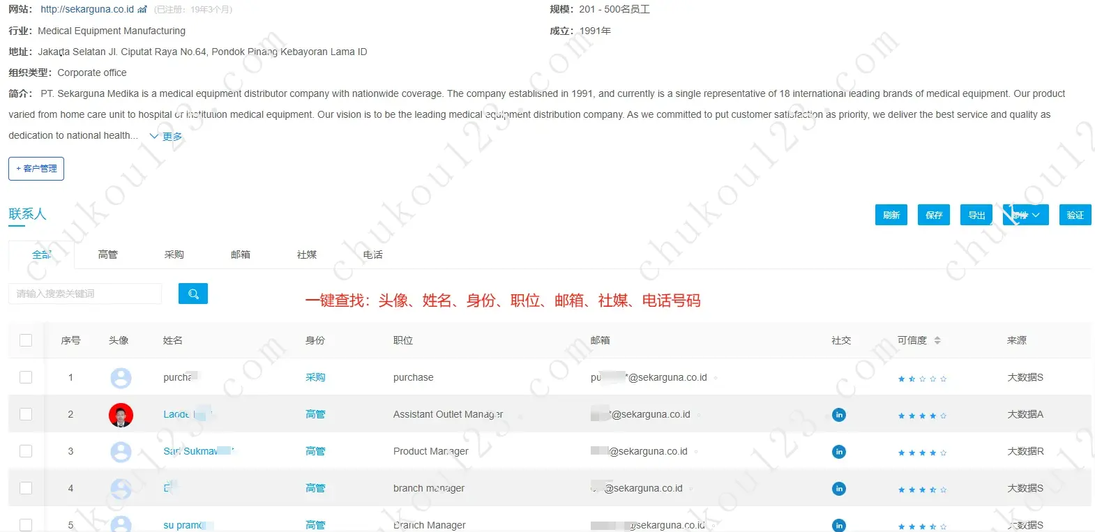 完全不用再花时间从官网、从其它地方寻找邮箱,一键就可以做邮箱、电话、社媒的验证。