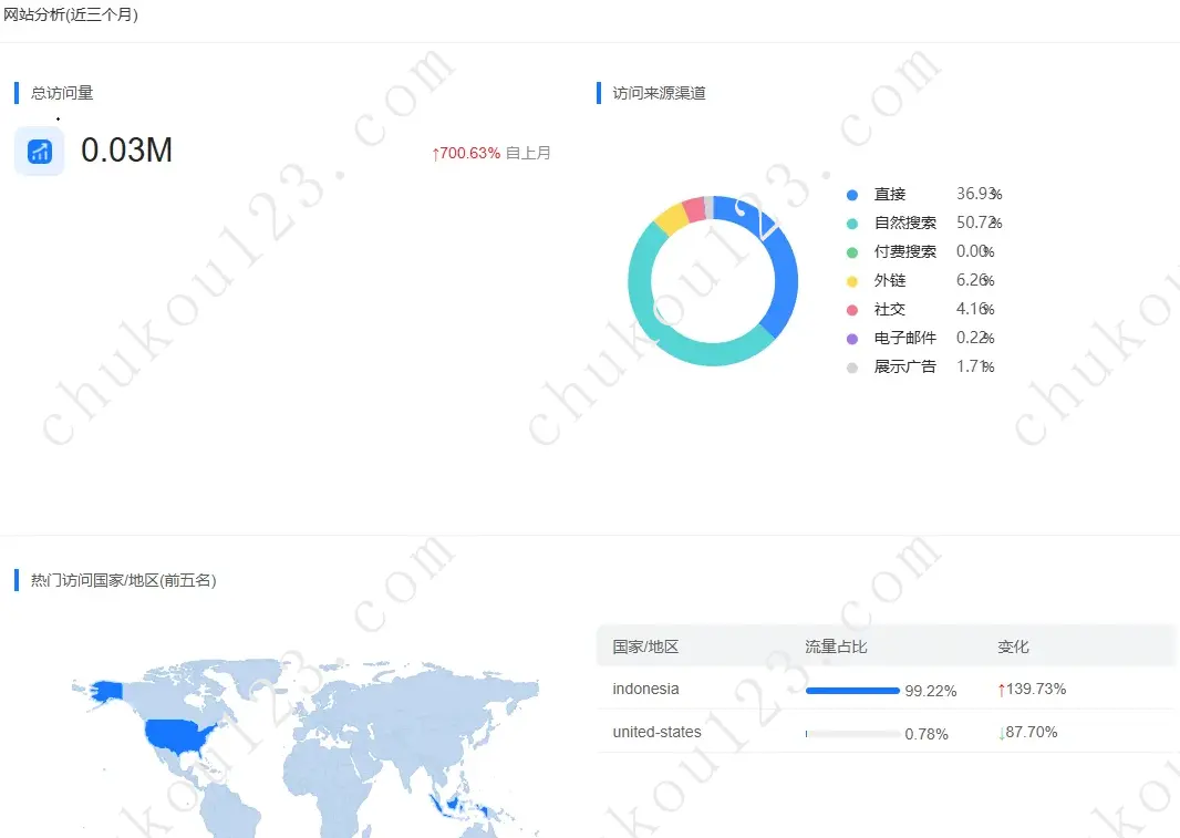 如果你是我们海关数据的会员,那就还能顺手做个客户背调,例如域名注册19年3个月,官网流量主要来自:印度尼西亚,有少量美国;每个月官网访问量0.03M,每个月有30000的次访问,很不错了哦!