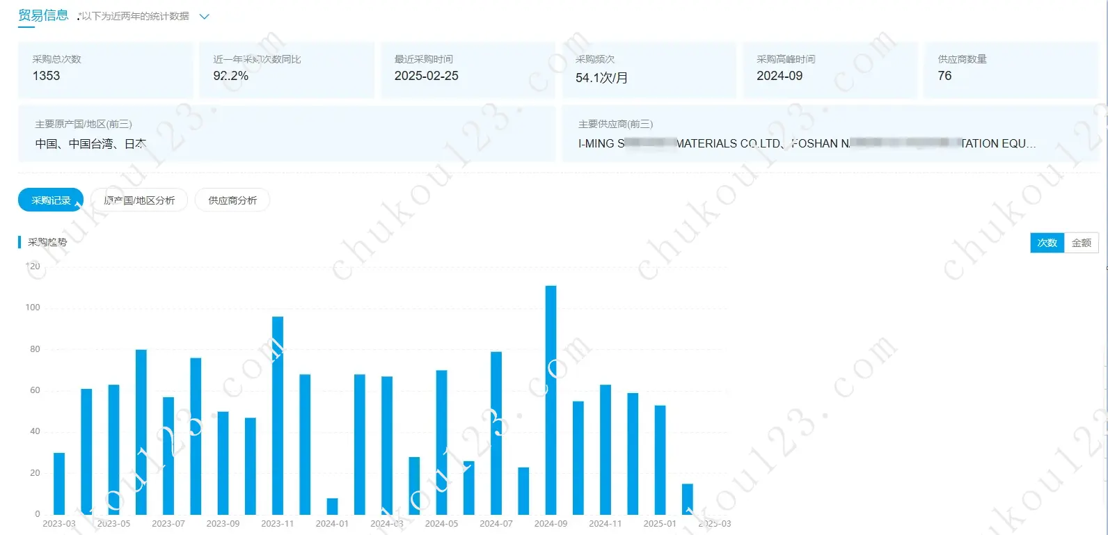 一次性直观展示采购行为,例如近一年采购1353次,最近采购时间2025年2月24日,平均每个月要清关54.1次;有76个供应商,主要从中国、中国台湾、日本采购;采购高峰期是2024年9月份。