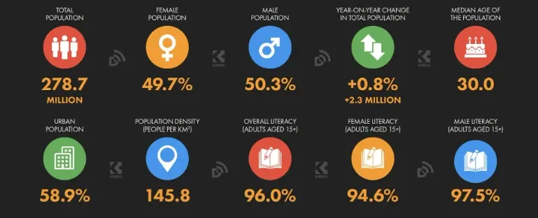 印尼总人口278.7million,女性占49.7%,男性占50.3%,年增总人口0.8%,城市人口58.9%,总体识字率(15岁以上人群)96%。
