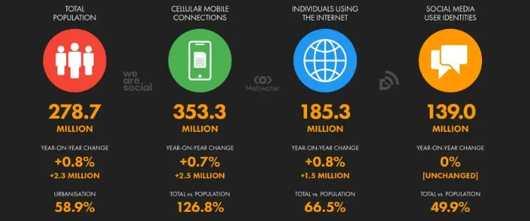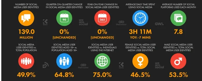 Queenie在很多场合都说过,自主开发国外客户要看客户们集中在哪些区域;社媒是当下的主流,而且一直呈上涨趋势,如下图,外媒统计的印尼社交媒体用户数量有139million,每天使用社交媒体的平均时间为3小时11分钟, 社交媒体用户身份与总人口占比49.9%, 也就是说有近一半的人在使用社媒。