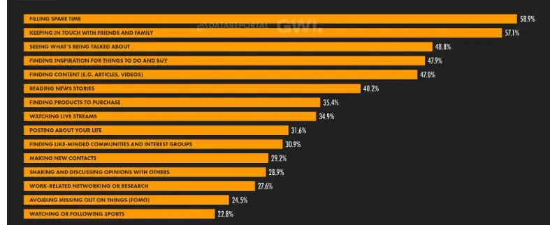 根据另一些数据表示,58.9%的印尼人讲社交媒体用于休闲,搞搞娱乐等, 57.1%的用户通过社媒和家人保持联系,如图,WhatsApp是印尼人花费时间最多的