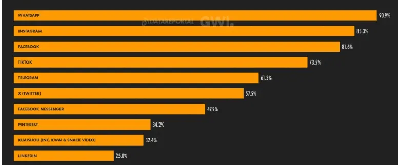 如图,WhatsApp是印尼使用率最高的社媒和通讯工具,占比高达90.9%,Instagram排名第二,facebook排名第三,Tik Tok排名第四。